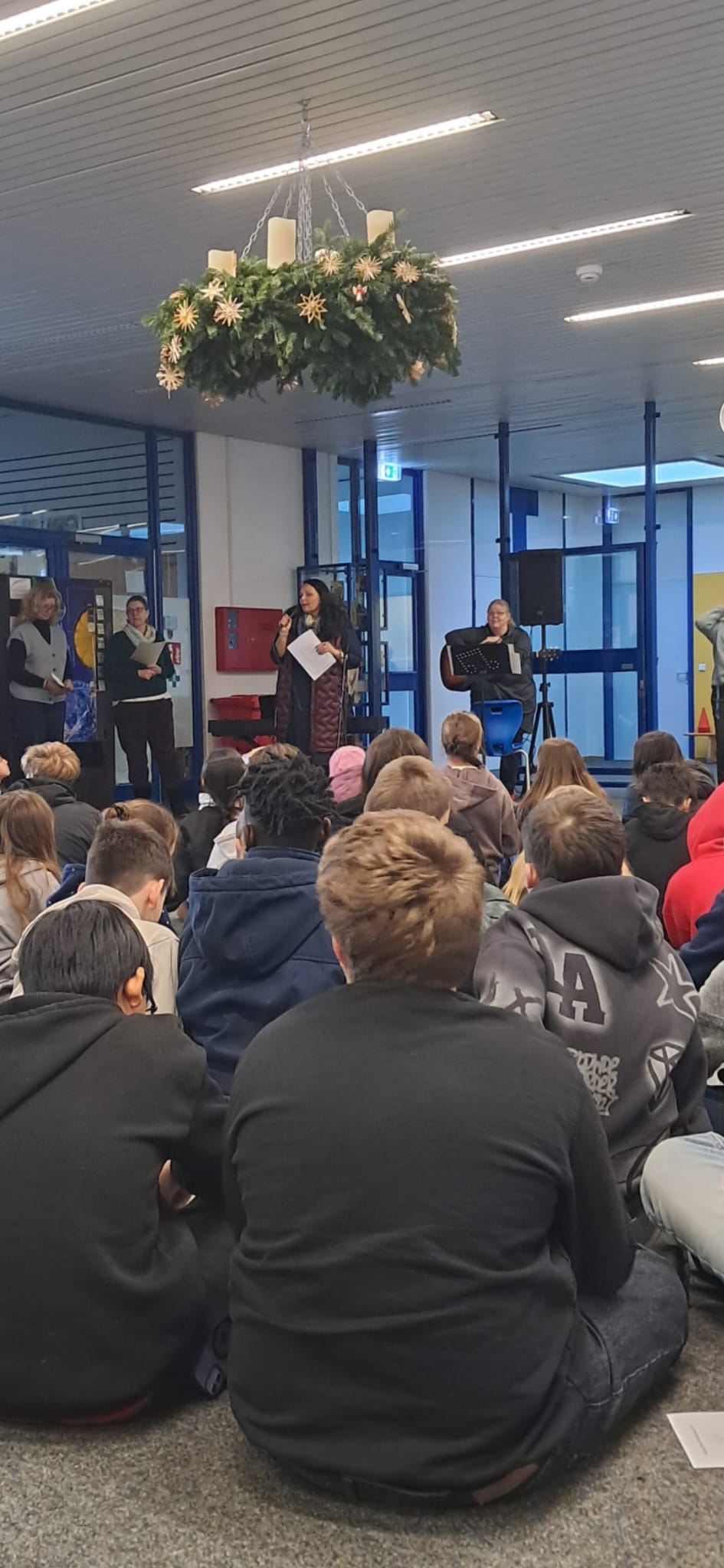 Am 1. Dezember 2025 fand an unserer Mittelschule zum ersten Mal die Adventsandacht mit feierlicher Adventskranzweihe statt. Die Schülerinnen und Schüler der